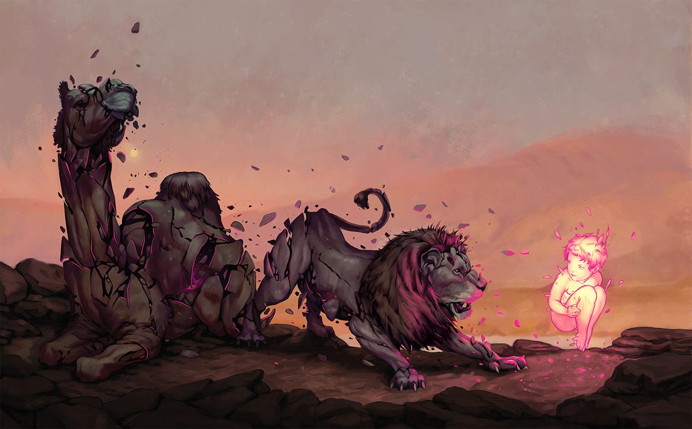 Inversamente, o niilismo ativo atua como um martelo que fragmenta o obsoleto para edificar o novo – destruição criativa, o niilismo como sinônimo de poder, encarnando transformação e vigor em vez de aceitação e decadência. Tenhamos as “três metamorfoses do espírito” como exemplo: o espírito do camelo, do leão e da criança. O camelo é aquele que suporta o peso com obediência, abaixa a cabeça para aquilo que lhe é imposto. Mas chega um momento em que o camelo precisa ir para o deserto — o lugar da solidão e da prova — para transformar-se. “No deserto, o espírito torna-se leão. Quer conquistar a liberdade e ser senhor no seu próprio deserto”. O leão é o espírito da força de negação, de enfrentamento aos costumes que lhe foram impostos, é o espírito liberto, mas ainda incapaz de criar. O leão, portanto, deve se tornar criança. “A criança é inocência e esquecimento, um recomeço, um jogo, uma roda que gira sozinha, um primeiro movimento, um dizer-sim sagrado.”. O espírito da criança é afirmativo e criativo.